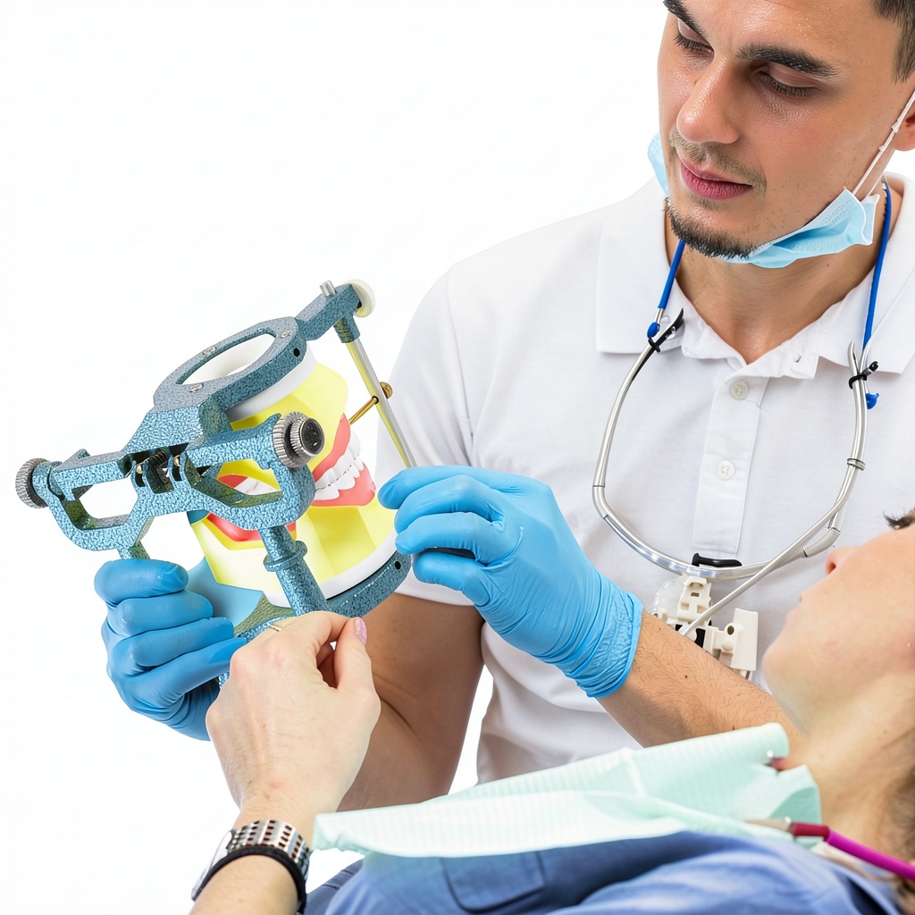 This dental articulator is ideal for realistic usage in dental laboratories, educational institutions, and clinical settings, where it facilitates denture fabrication, occlusal adjustments, and training demonstrations. It is commonly used during procedures such as mounting upper and lower casts with plaster, aligning the occlusal plane, and setting vertical height and bite relations with adjustment screws. The target audience includes dental students learning jaw mechanics, dentists performing treatments, and technicians creating precise dentures, ensuring efficient workflow and enhanced accuracy in dental care.